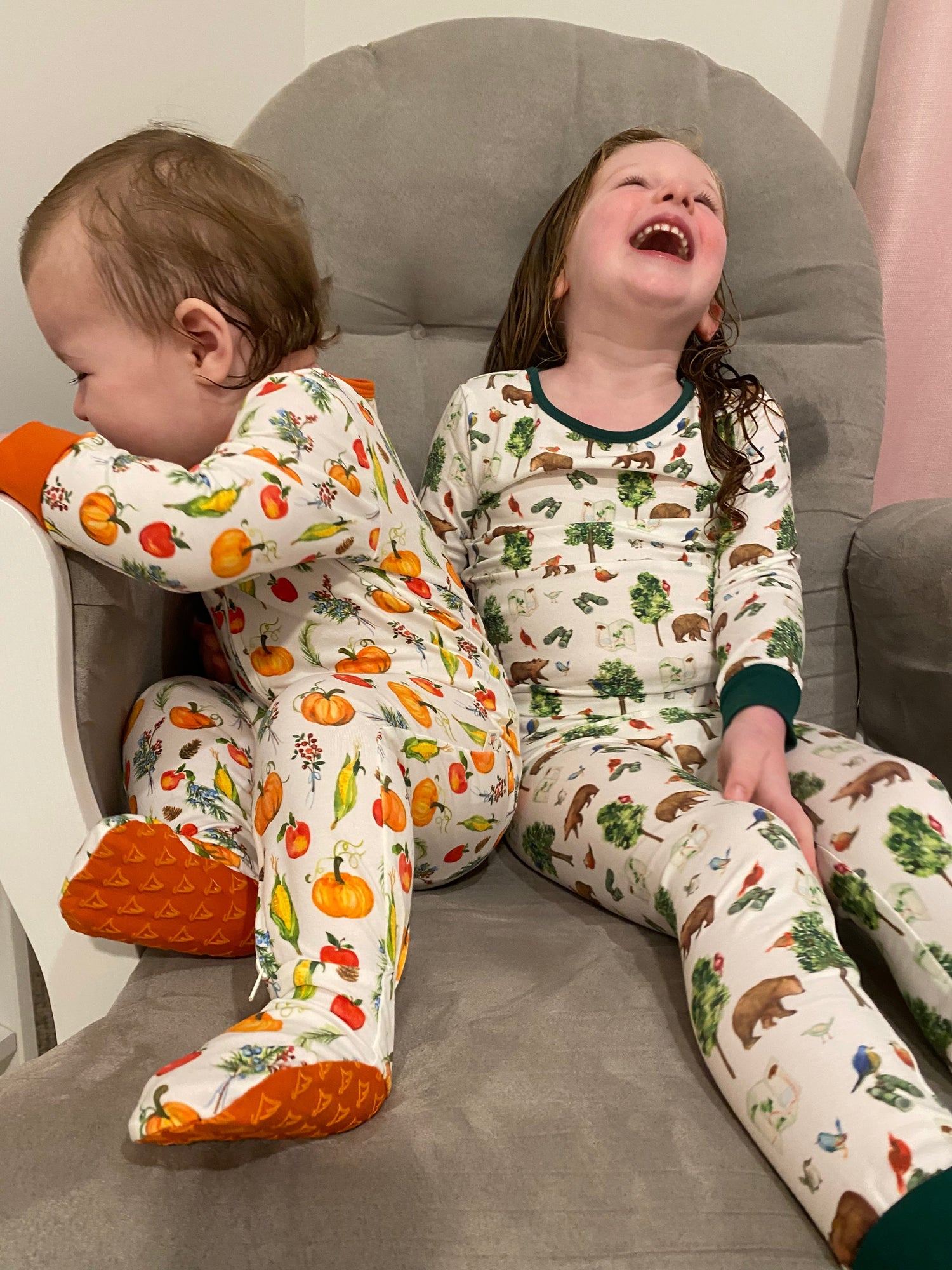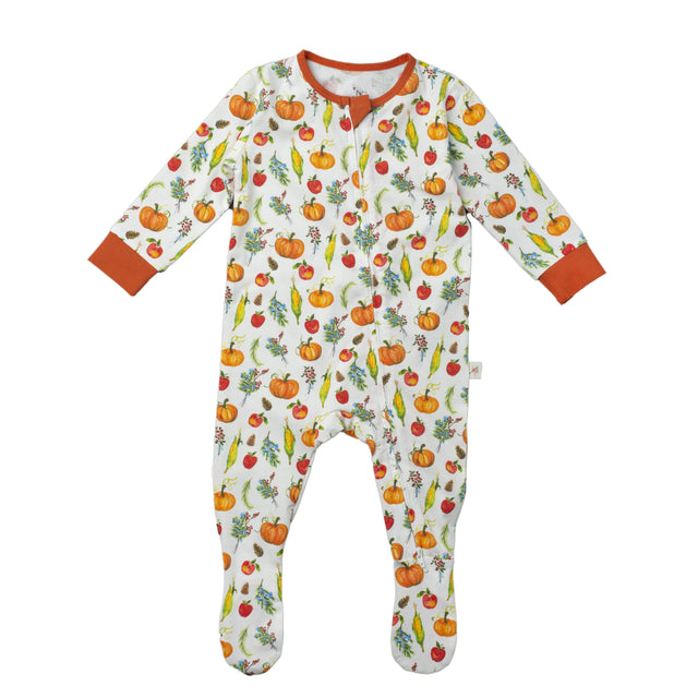 Double Zip Footed One-Piece - Fall Harvest Pumpkins - cotton blend / 6-9m is backordered and will ship as soon as it is back in stock.