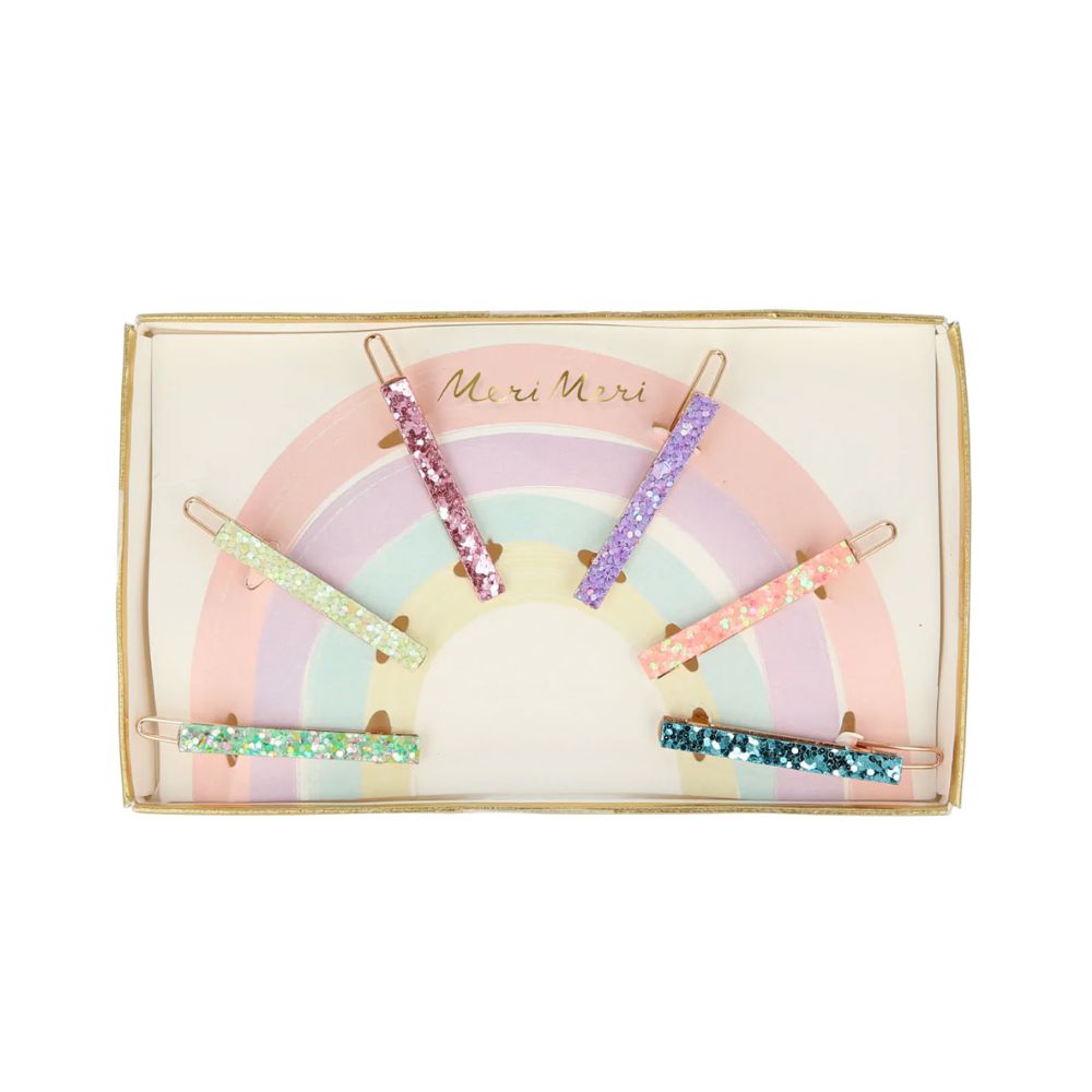 These shimmering hair clips will make any hairstyle look amazing! Featuring a set of six different colors with chunky glitter detail. Perfect to wear to parties or to make any day a special hair day!