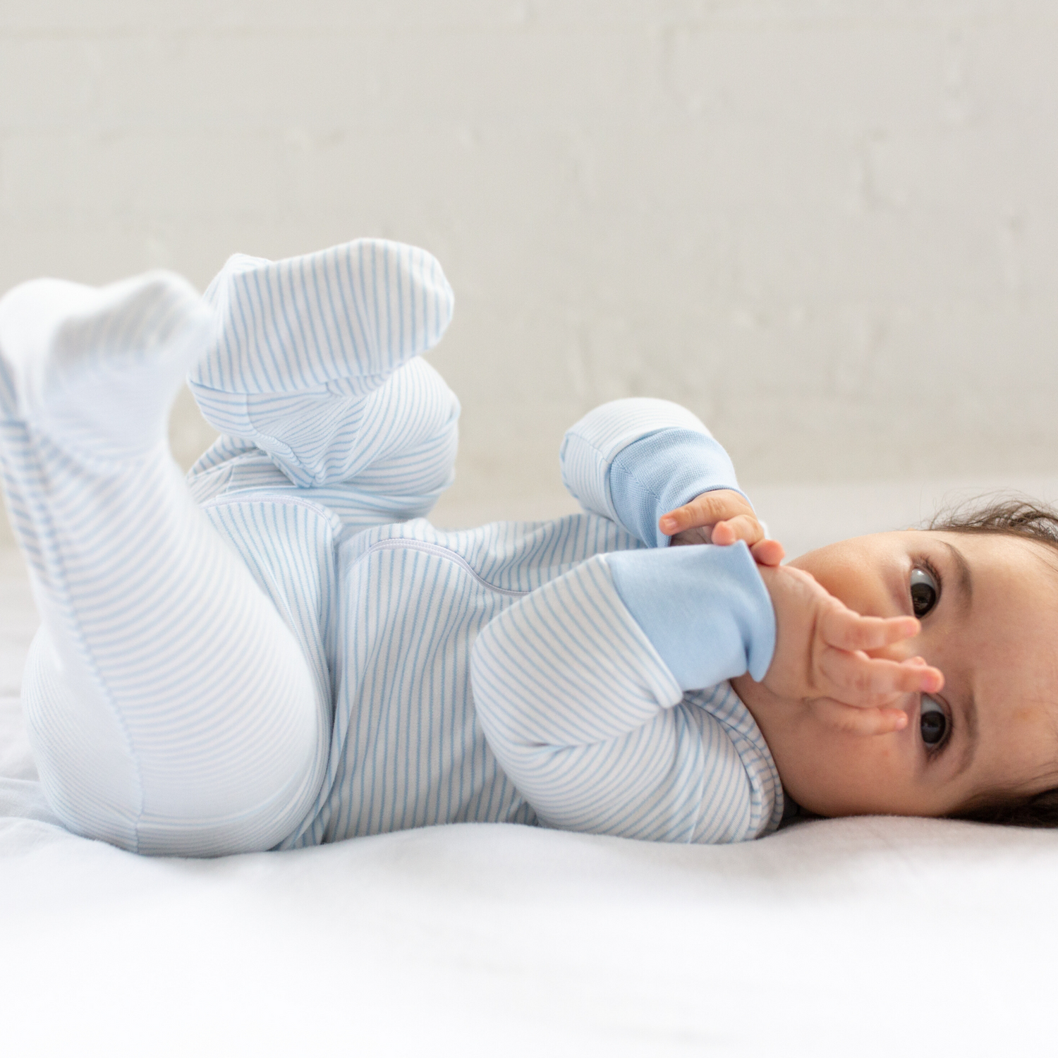 Classic Stripe Zipper Romper in Light Blue - light blue / pima cotton / NB is backordered and will ship as soon as it is back in stock.