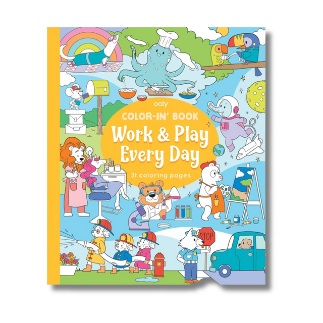 Color in some future possibilities with OOLY's Color-In' Work and Play Every Day Coloring Book. The perfect gift for dreamers and doers alike, this coloring book for kids will awaken their imaginative spirit. With 31 ready-to-color-in pages depicting cutie characters like a bunny florist, a park ranger bear, and an elephant astronaut, your little one will delight in deciding just how they want their pictures to look.